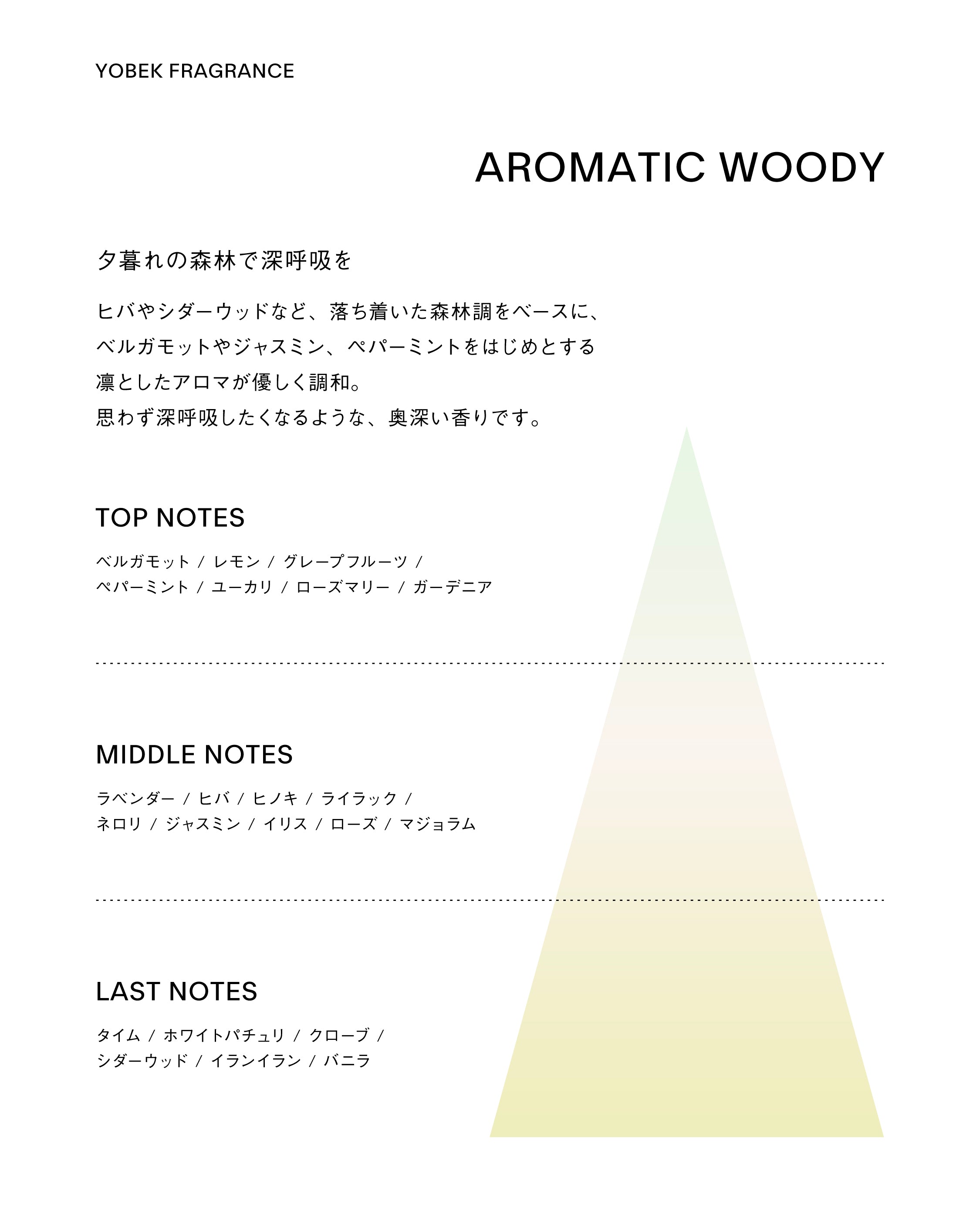 A: 深呼吸したくなるような心地の良い森林調のハーバルウッディに、ガーデニアやイリス、ジャスミンなどを調和した上質で凛とした香りです。